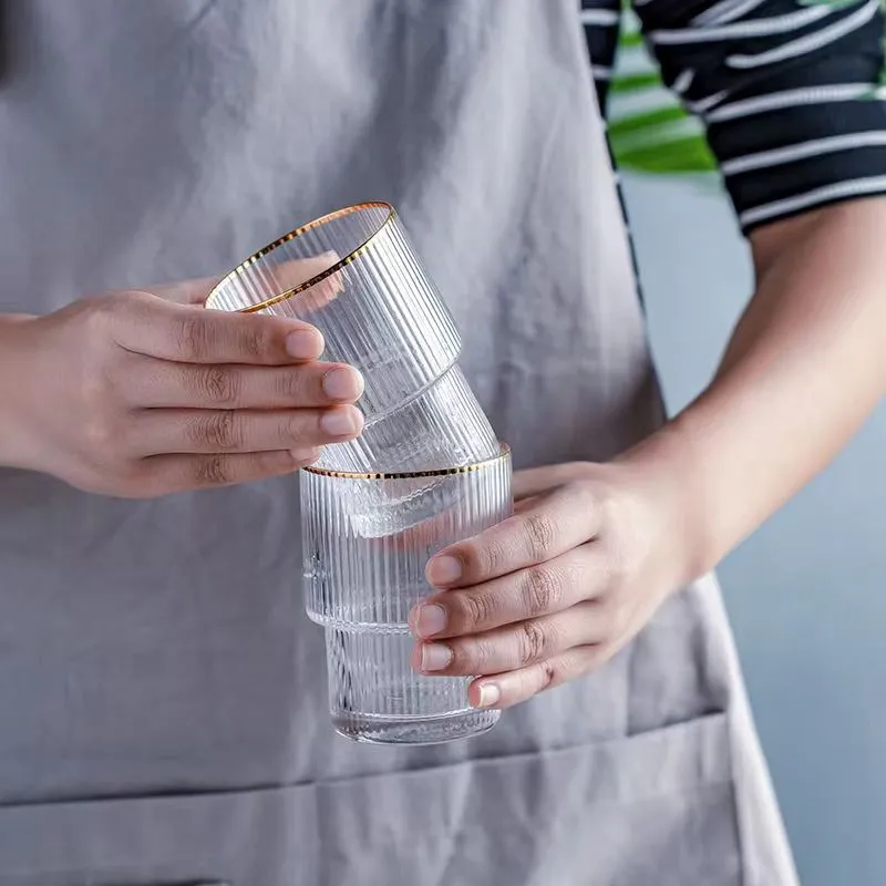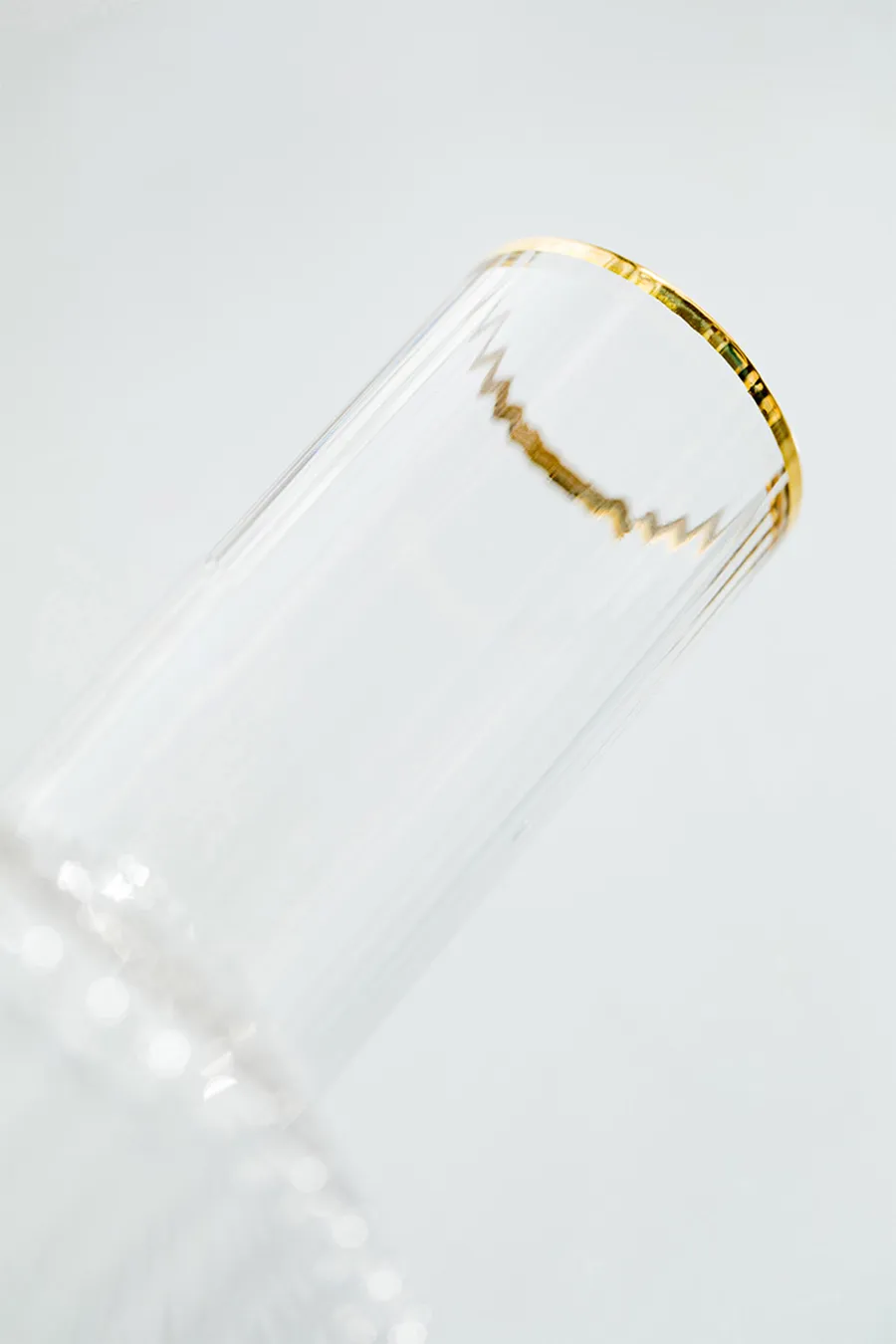 Elegancja w każdym detalu. Szklanka Raifu Gold została wykonana z wysokiej jakości, ryflowanego szkła, które dodaje jej wyjątkowego uroku. Górna część szklanki ozdobiona jest złotym paseczkiem, nadając jej jeszcze bardziej ekskluzywny wygląd. Ta szklanka doskonale sprawdzi się zarówno na co dzień, jak i na wyjątkowe okazje, dodając elegancji każdemu spotkaniu.